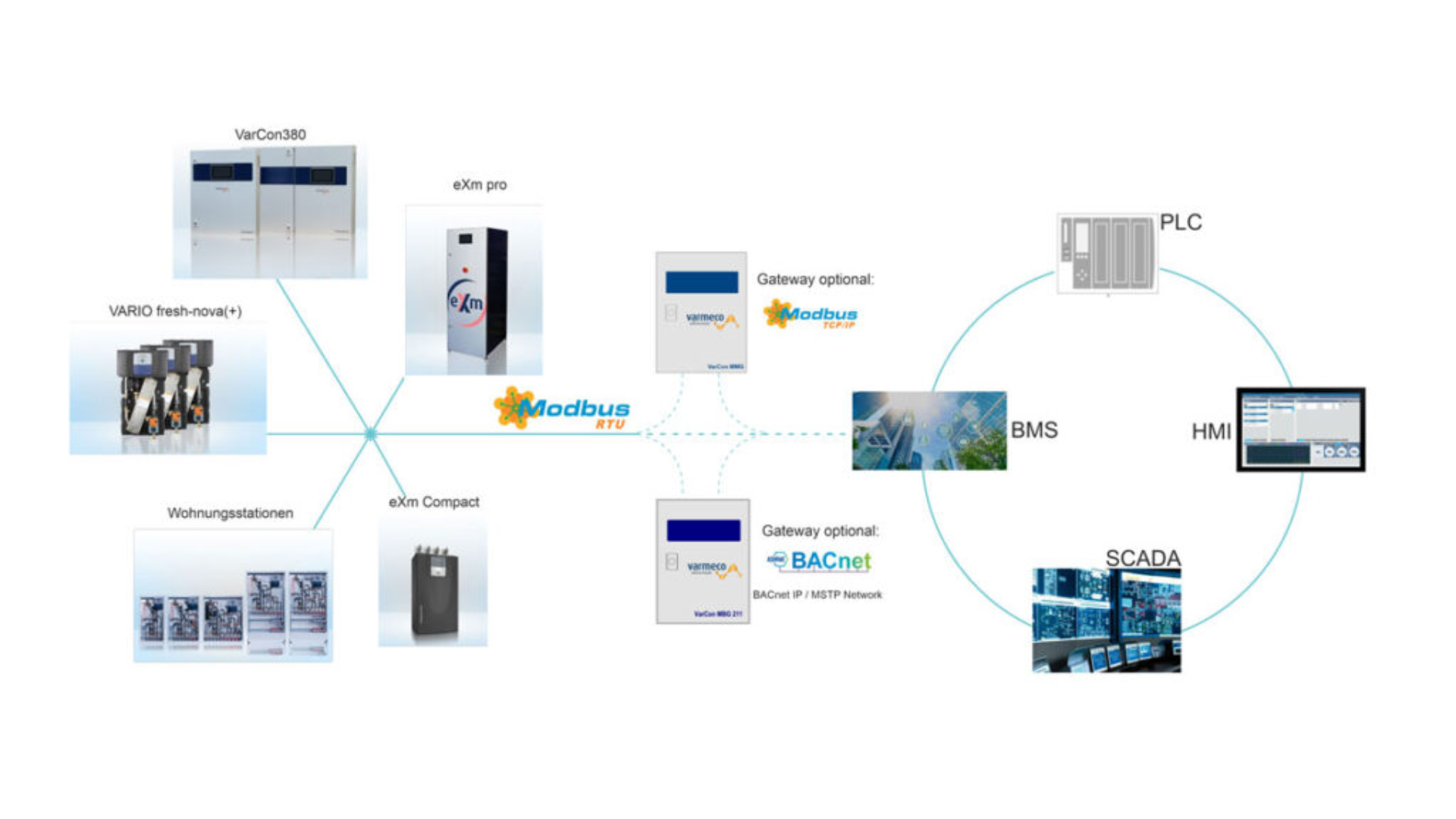 È possibile indirizzare anche un altro protocollo di destinazione. In questo caso possiamo utilizzare il nostro gateway Modbus Modbus (MMG) al protocollo ModbusTCP. Informazioni sul nostro gateway Modbus-BACnet (MBG) possiamo convertire al protocollo BACnet.