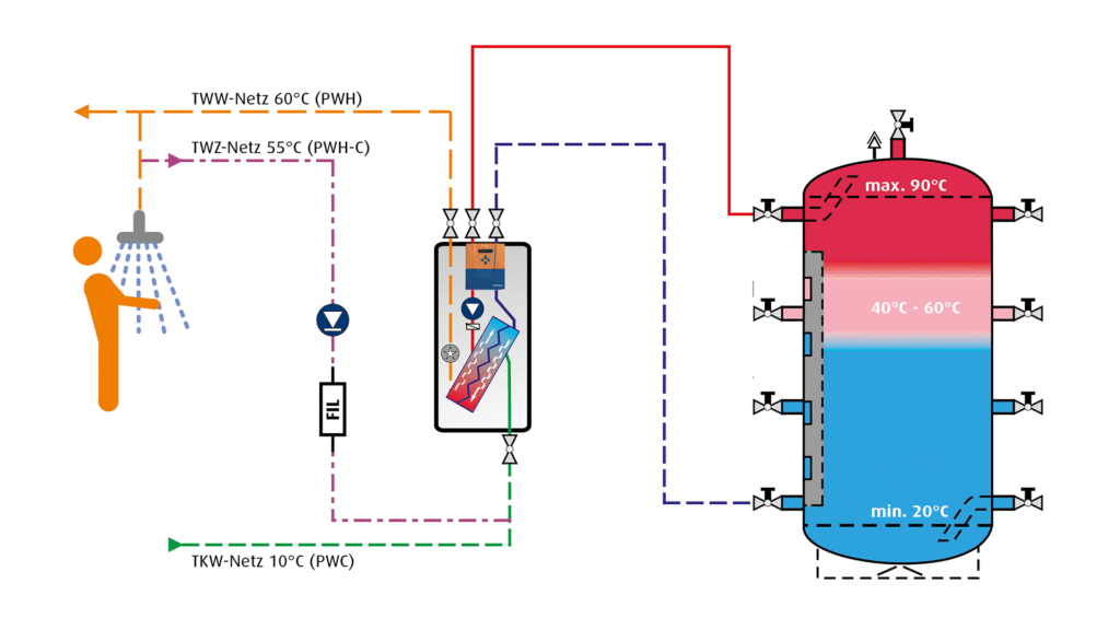 Die Aufgabe der Energiespeicherung, statt eines hygienekritischen Boilers, übernimmt jetzt der Pufferspeicher, gefüllt mit Heizwasser. Denn der Wärmeerzeuger kann meist nicht so viel und so dynamisch Energie bereitstellen, wie im Moment des Warmwasserbedarfs nötig wäre.