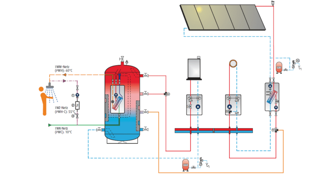 Er eignet sich als Wärmebatterie in vielfältigen und hydraulisch anspruchsvollen Heizanlagenvarianten. Durch seine 10 Anschlussmuffen (davon 8 zur freien Verwendung) lassen sich Wärmeerzeugerkreise und Wärmeverbraucherkreise mit unterschiedlichen Temperaturniveaus auf unterschiedlichen Höhen einbinden. Neben der Leistungsentkopplung der Kreise wird so zugleich die vorteilhafte hydraulische Entkopplung erreicht. Der Schichtkanal vereinfacht die temperaturgerechte Rücklaufanbindung ohne hydraulischen Mehraufwand und verringert unerwünschte Mischungseffekte.