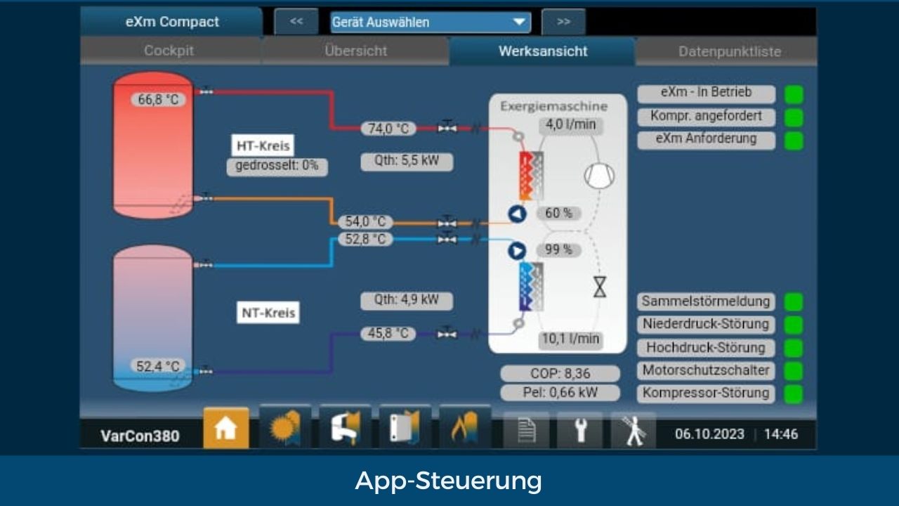 Die eXergiemaschine ergänzt die Heizungswärmepumpe und die solarthermische Anlage und bewirkt einen Temperaturhub auf bis zu 65 °C, damit die konventionellen Radiatoren bedient und hygienisch Warmwasser bereitet werden kann. Nur an extrem kalten Tagen kommt ein 12-kW-Spitzenlastbrenner zum Einsatz, der mit Holzpellets befeuert wird. Ein varmeco-Regler VarCon380 verwaltet das Wärmesystem.