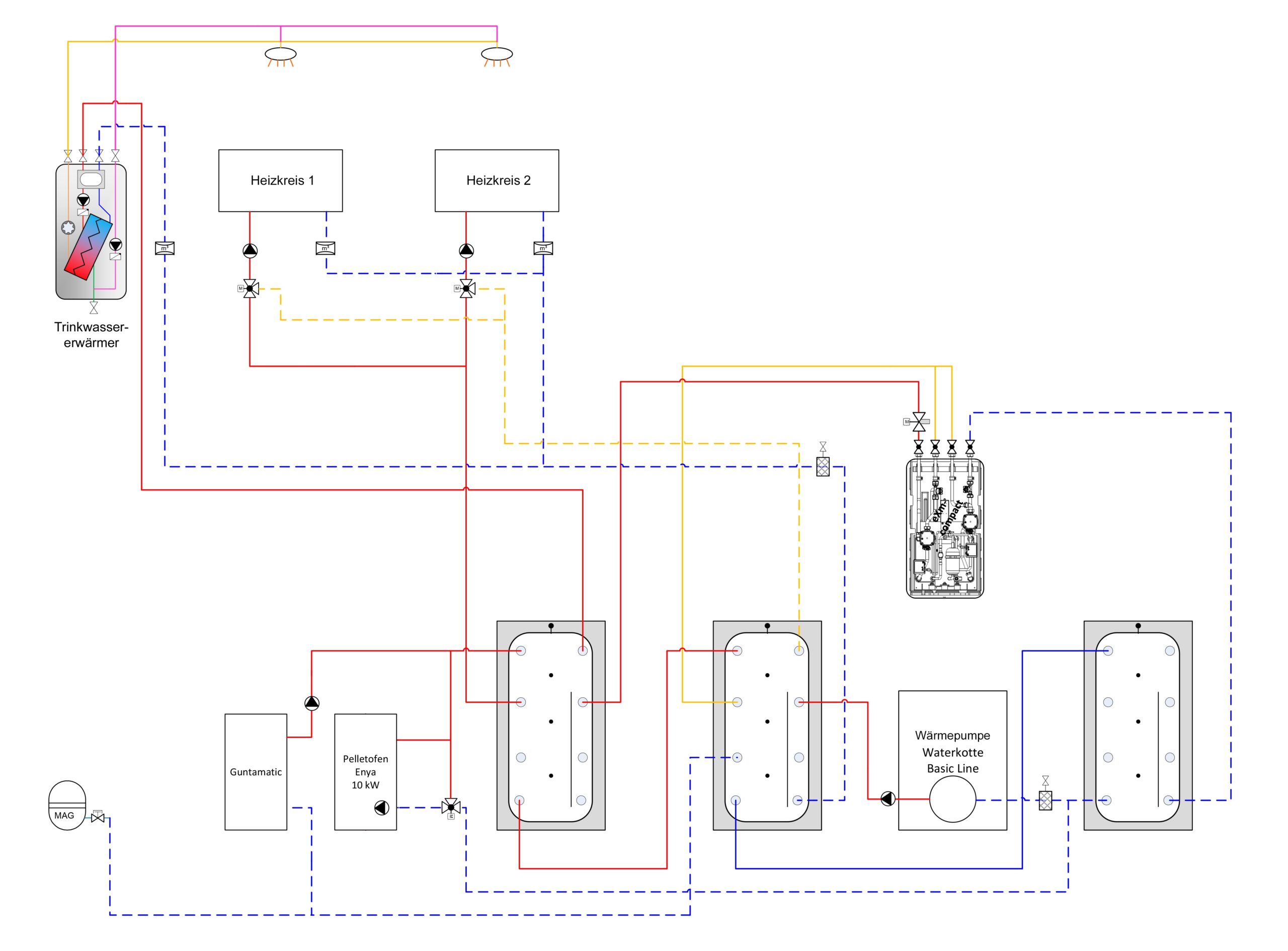 Die eXm ist eine von varmeco und der Firma BMS-Energietechnik entwickelte Wasser-Wasser-Wärmepumpe, die für höhere Quellentemperaturen von 30 °C und mehr konzipiert ist. Sie ersetzt die Heizungswärmepumpe nicht, sondern ergänzt sie sinnvoll. Die Wärmepumpe kann in ihrem optimalen Betriebsbereich arbeiten und muss nur 35 oder 40 °C liefern. Die eXm bewirkt einen weiteren Temperaturhub auf bis zu 65 °C. Jedem der drei installierten Speicher ist ein eigener Temperaturbereich (kühl, warm, heiß) zugeordnet. Die Heizkreise der beiden Gebäude und der hydraulische Durchlauferhitzer zur Warmwasserbereitung greifen auf den heißen Speicher zu, der eine Temperatur von etwa 65 °C bereitstellt. Alle Regler arbeiten temperaturgeführt und autonom. Zusätzlich kommt der varmeco-Systemregler VarCon380 zum Einsatz, an dem sich der Betriebsstatus der Quellen, die Wärmeflüsse oder Störmeldungen ablesen lassen.